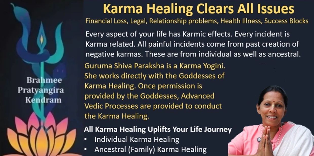 The core cause of a person's issue is identified. The current issue is usually from self created past negative karmas, inherited ancestral negative karmas/curses or from negative energies/entities in the residential or business premises. Once identified, powerful advanced spiritual healing prayer processes are conducted by Guruma Shiva Paraksha with direct guidance from Karma healing celestial Goddess Maha Pratyangira Devi to heal the specific core cause. The healing process is extremely effective with amazing results. Once you understand that all issues are based on the law of Cause and Effect, you will experience and know that all negative karma created by you in your past will come back to you as painful experiences. This powerful spiritual Karma healing process cleanses, dismantles and reconstructs the past negative karma. If the negative karma harm done requires the effect of an accident with an arm cut off, the healing proccess may reduce the effect to only a nail being removed as some Karma still has to be beared. This is the blessing received from conducting this healing process.